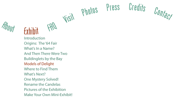 The distinctive form of the Candela Structures is a kind of minimal surface. Like a dome, it can be generated by forming a wire into the shape of the edge and dipping it in a viscous liquid, like soap or liquid plastic as in the small study model above, center. The model at right shows an empty shell, like the two that remain at the site today. The model at left includes the canted glass walls that were part of the buildings during the Fair. (Photos and models by Kirsten Hively)